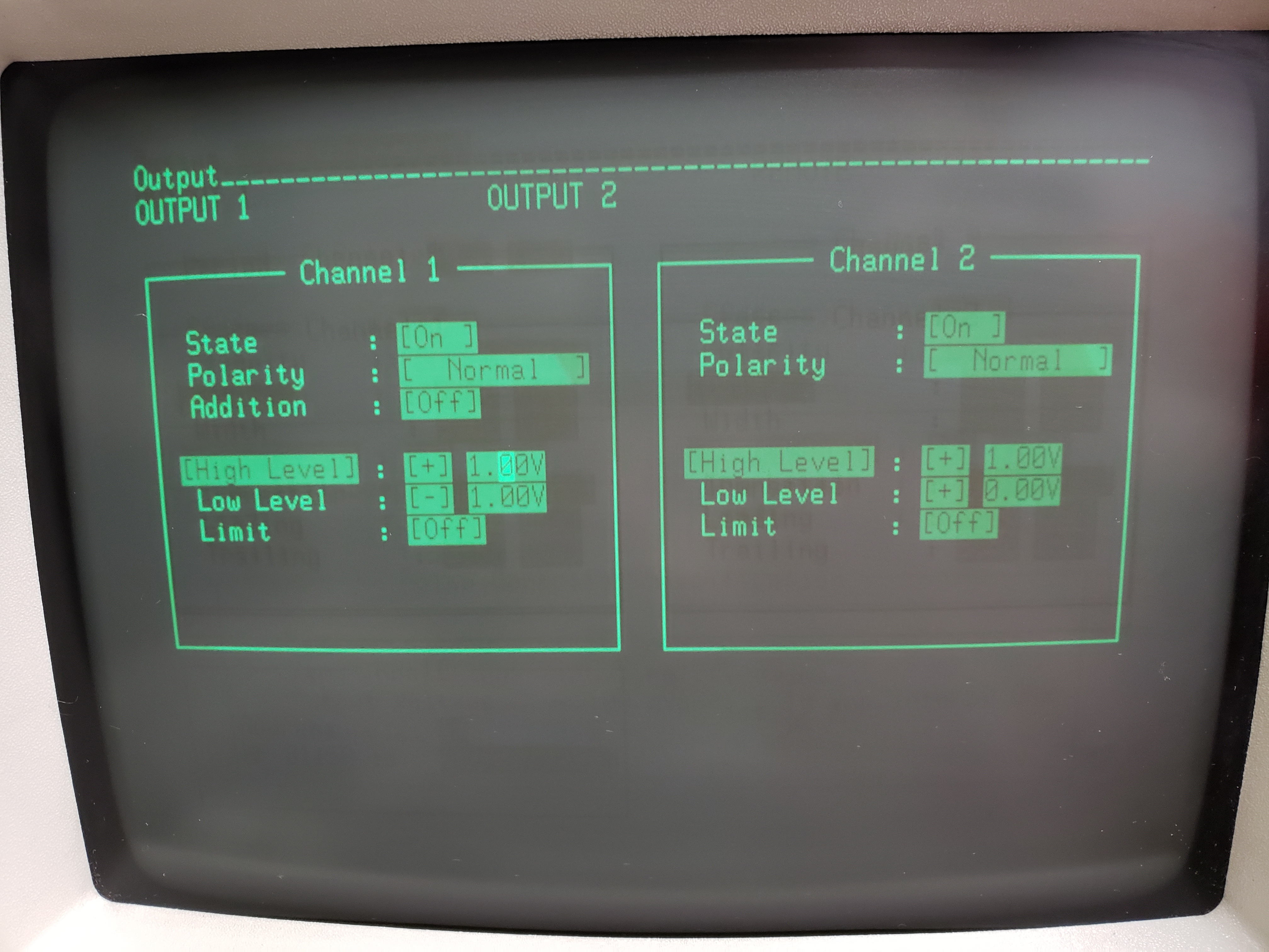 The 8115A is a two-channel pulse generator with an unusual CRT-based user interface. High level, low level, high period, low period, overall period, and delay are selectable via a keypad from different screens on the CRT. For use in ATE systems, the instrument features extensive GPIB programmability functionality.